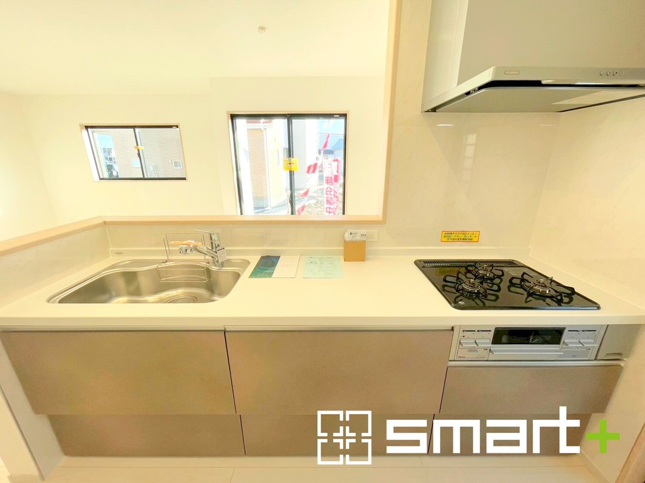 1号棟 ~人気のカウンターキッチン~ ・キッチンには余計な柱が無いので、リビングが見渡せ開放感のある造りとなっております。 ・蛇口には浄水器が内蔵されるなど機能面でも優れたキッチンです。