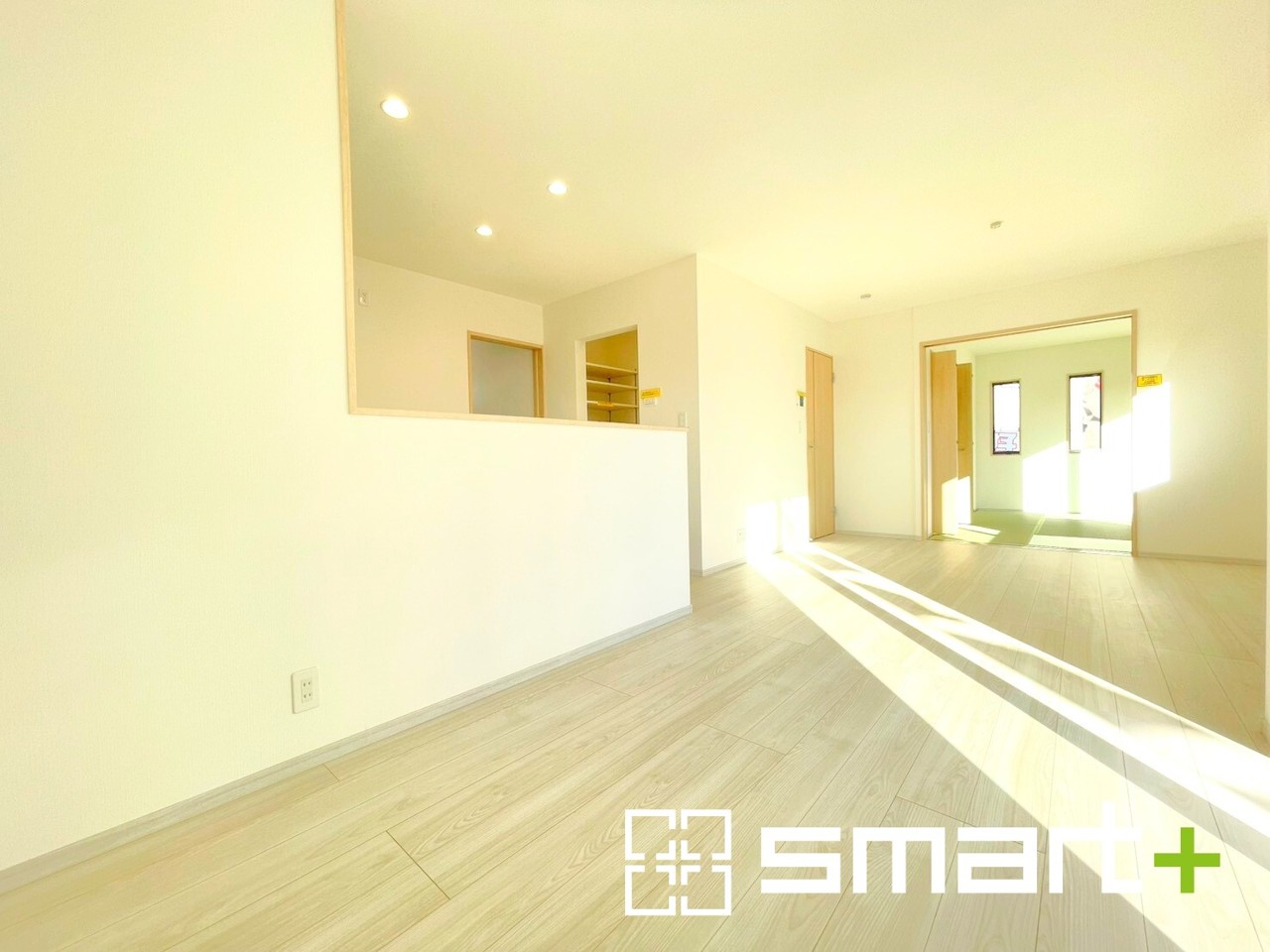 1号棟 ~家族団らんにピッタリの広々リビング~ ・自然の光が降り注ぐ明るいLDKは家族団らんにピッタリ。 ・隣接の和室を続き間として利用すれば22帖超の広々空間になります。