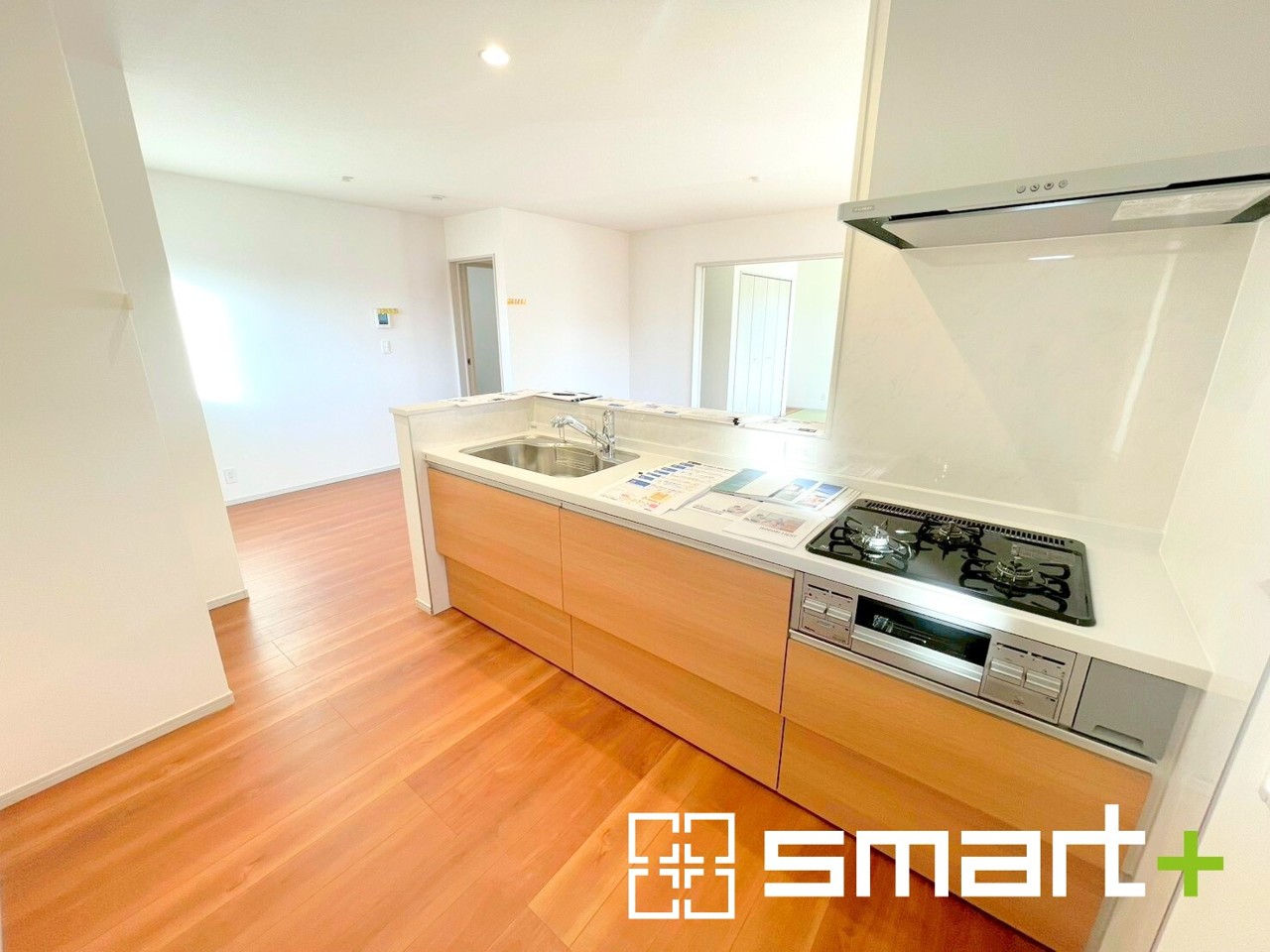 1号棟 ~お料理がはかどる三口コンロ~ ・同時進行で調理が可能な三口コンロで家事の時短に。 ・グリルも付いているのでお料理の幅も広がりますね。