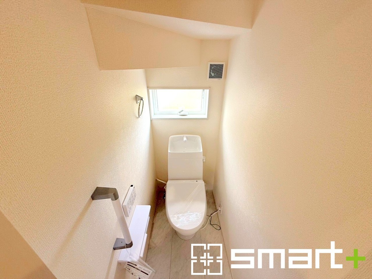 ~小窓付きの明るいトイレ~ ・使用後や掃除の際には新鮮な空気を取り込み換気ができます。 ・背面のスペースにちょっとした棚を設置すれば、トイレットペーパーのストックなども置けますね。 (4号棟)