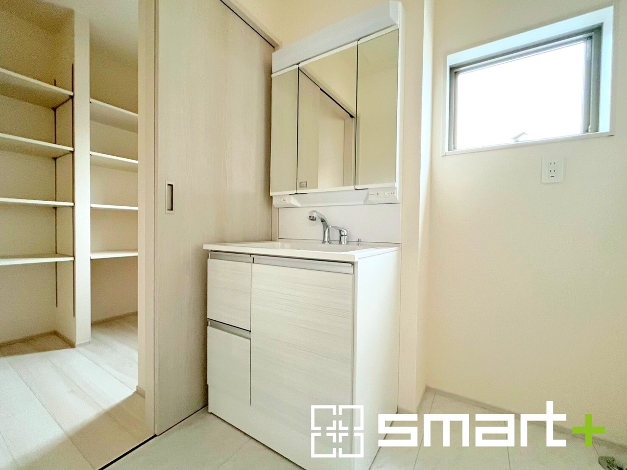 ~人気の三面鏡を採用~ ・洗面台は三面鏡仕様なので鏡の角度を変える事で頭の後ろの方までご確認可能です。 ・鏡の裏が収納になっておりますので、洗面台周りもスッキリと片付きます。