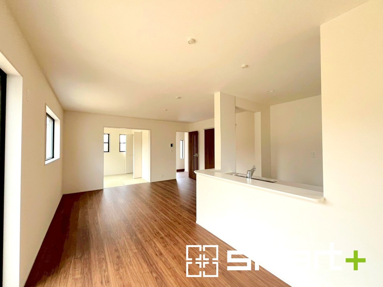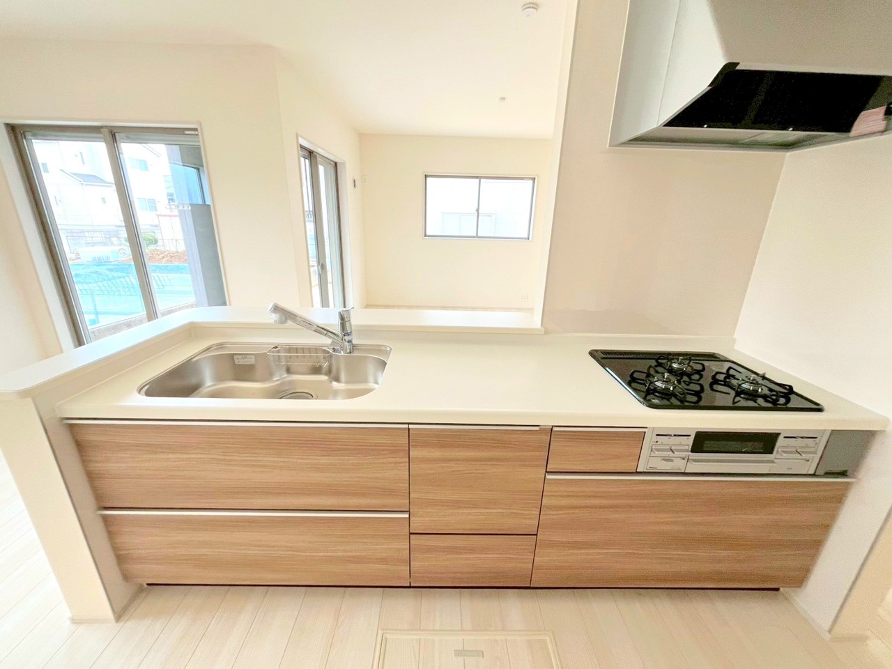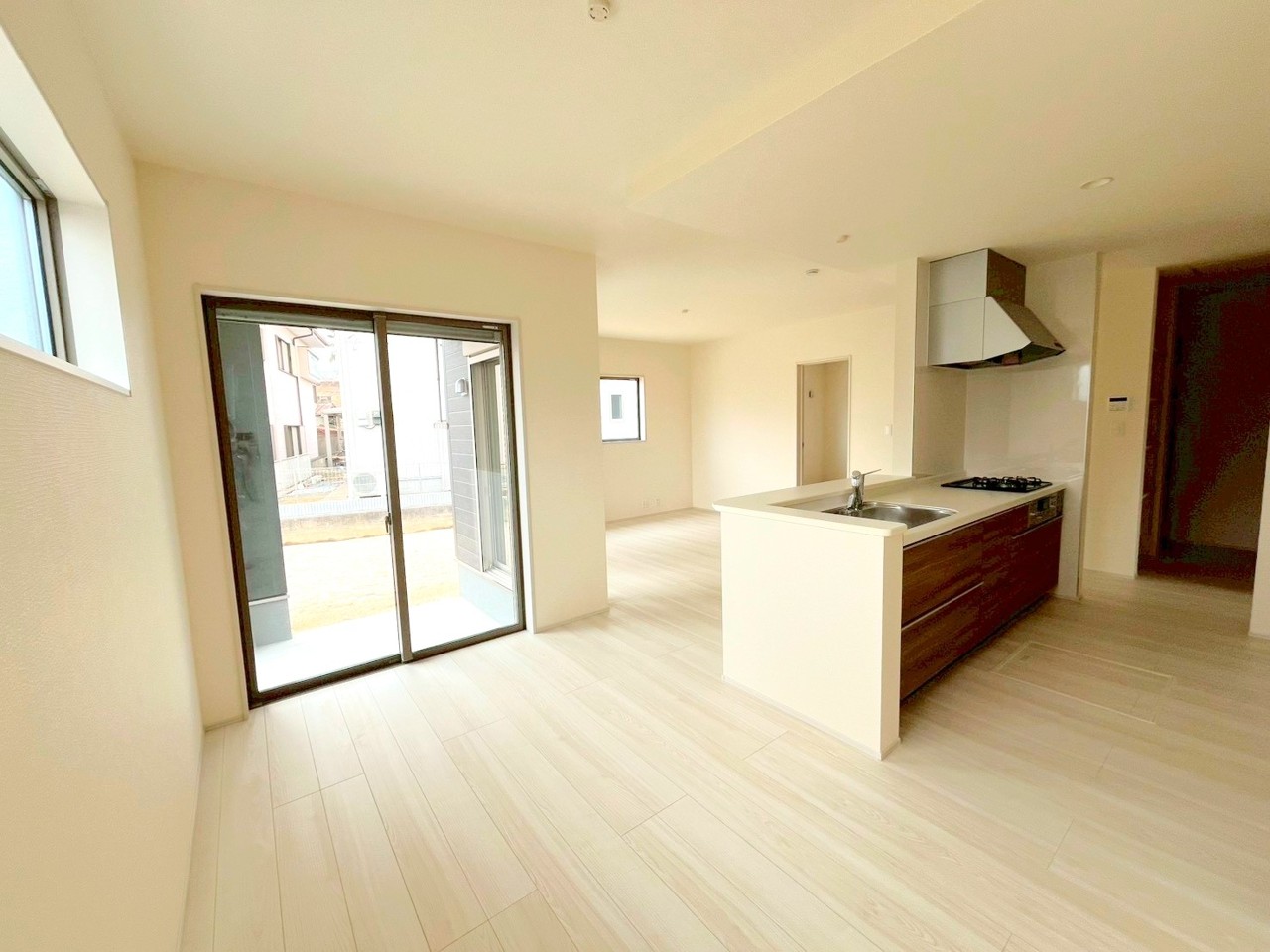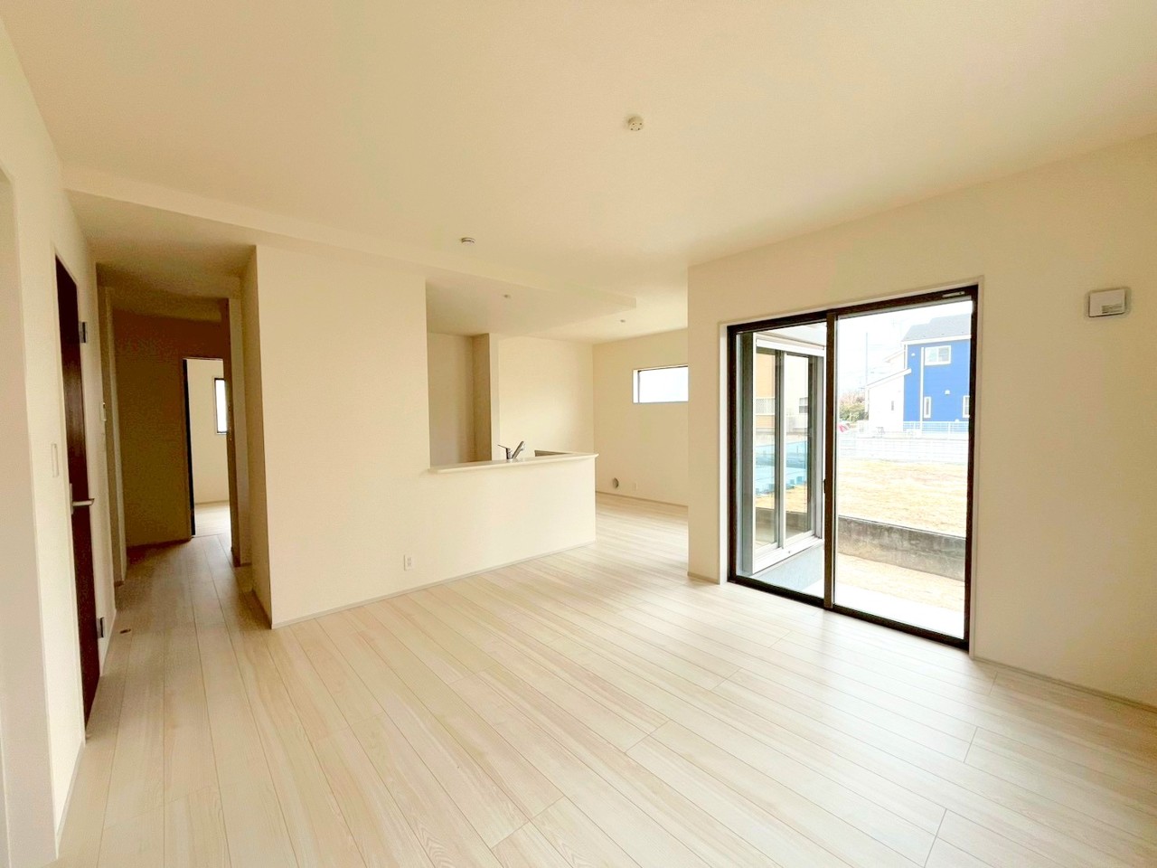 1号棟 ~穏やかな陽の入るLDK~ ・大きな窓のあるLDKは陽当りも良好で明るい空間となっております。 ・ご家族団らんなど過ごす時間の多いLDKが明るいのは嬉しいポイントですね。