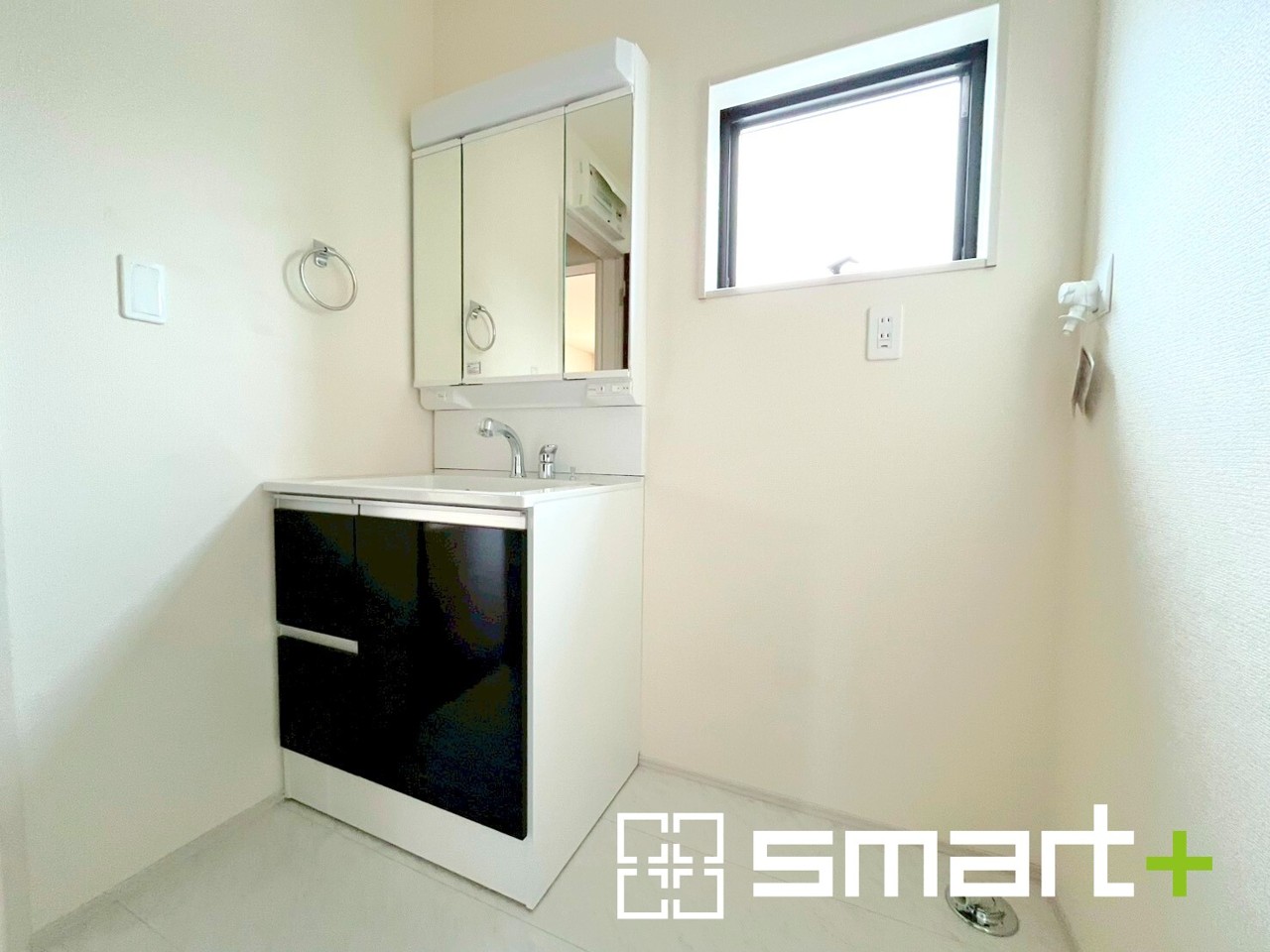 1号棟 ~人気の三面鏡を採用~ ・洗面台は三面鏡仕様なので鏡の角度を変える事で頭の後ろの方までご確認可能です。 ・鏡の裏が収納になっておりますので、洗面台周りもスッキリと片付きます。