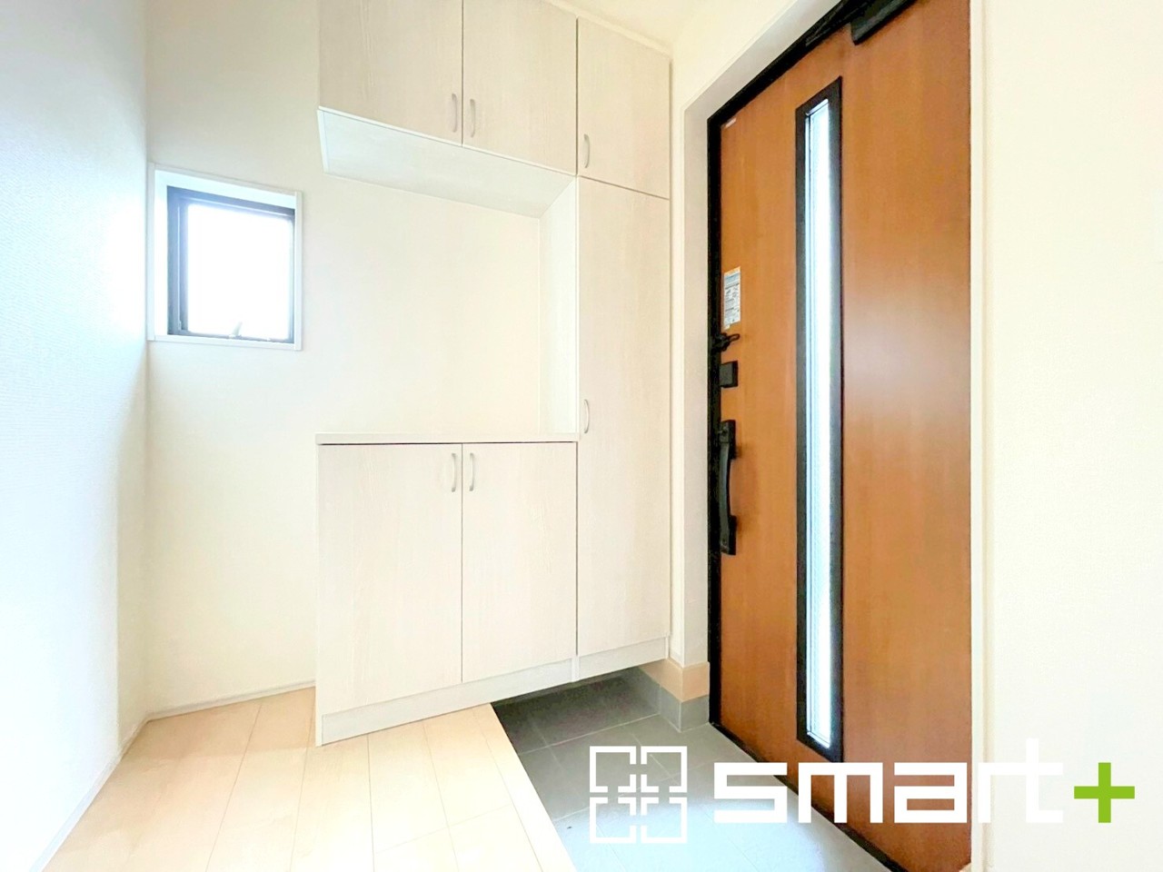 ~圧迫感のない明るい玄関~ ・窓に加えて玄関ドアのガラス部分からも穏やかな陽が入り、明るい玄関になります。 ・飾り棚としても演出できるコの字型の下駄箱は大容量の収納力。