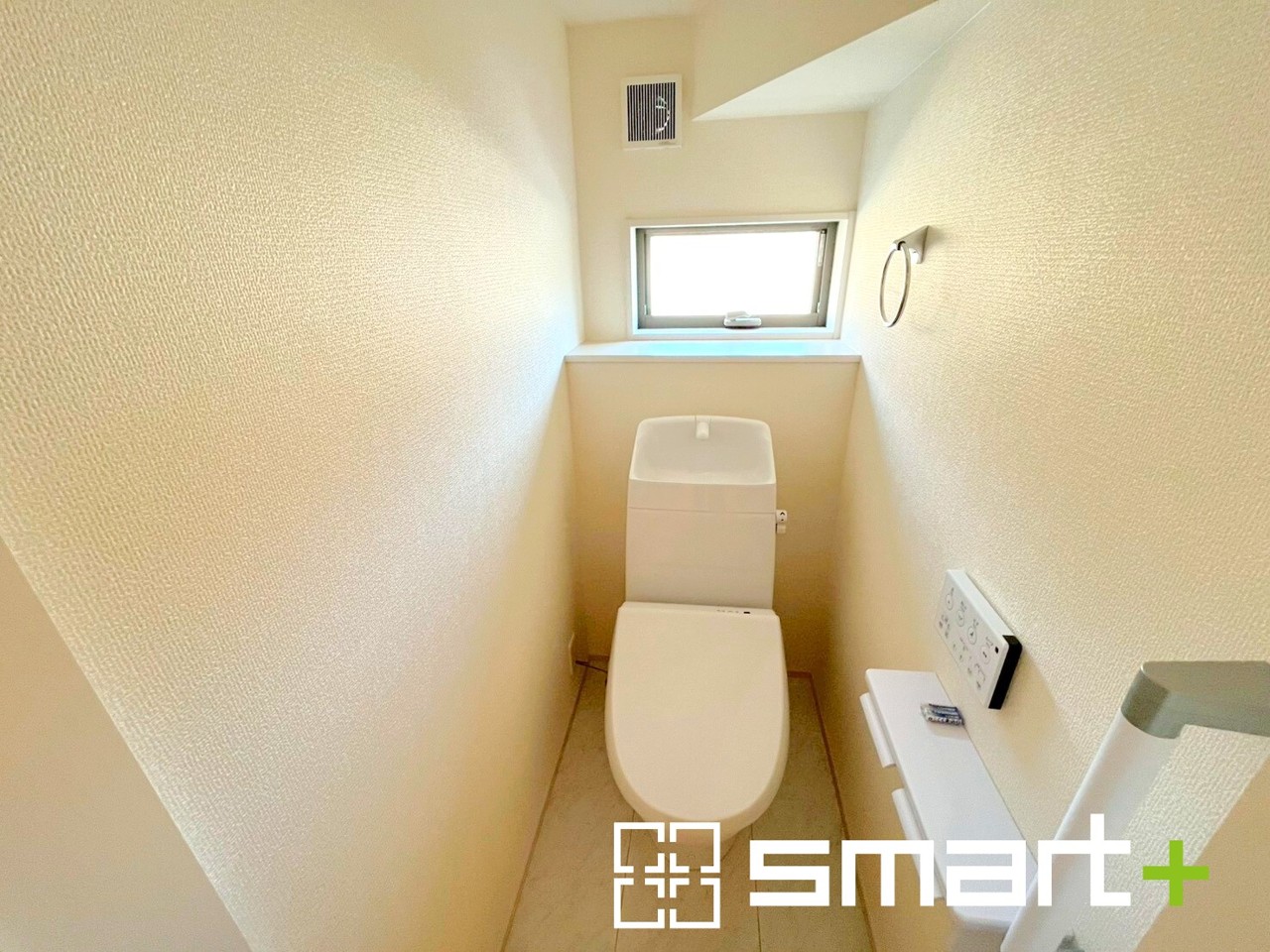 ~小窓付きの明るいトイレ~ ・使用後や掃除の際には新鮮な空気を取り込み換気ができます。 ・背面のスペースにちょっとした棚を設置すれば、トイレットペーパーのストックなども置けますね。