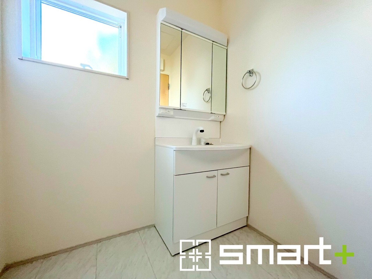 3号棟 ~明るい洗面スペース~ ・窓から明るい陽が入り、気持ちよく朝の支度ができますね。 ・使い勝手の良い三面鏡タイプのシャワー付き洗面化粧台。鏡の裏に収納があるので洗面台周りもスッキリ。