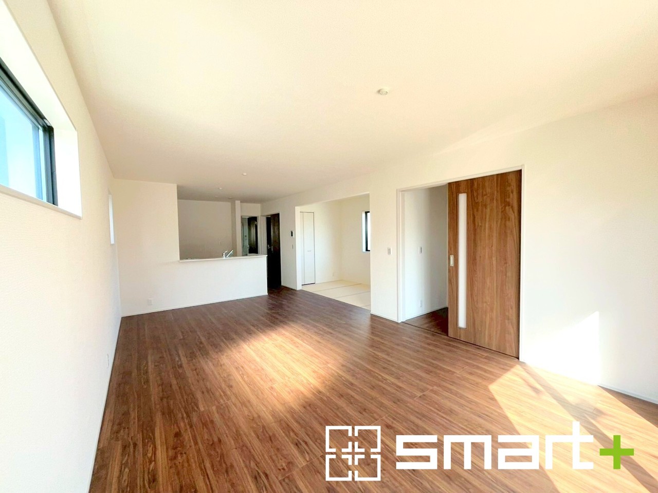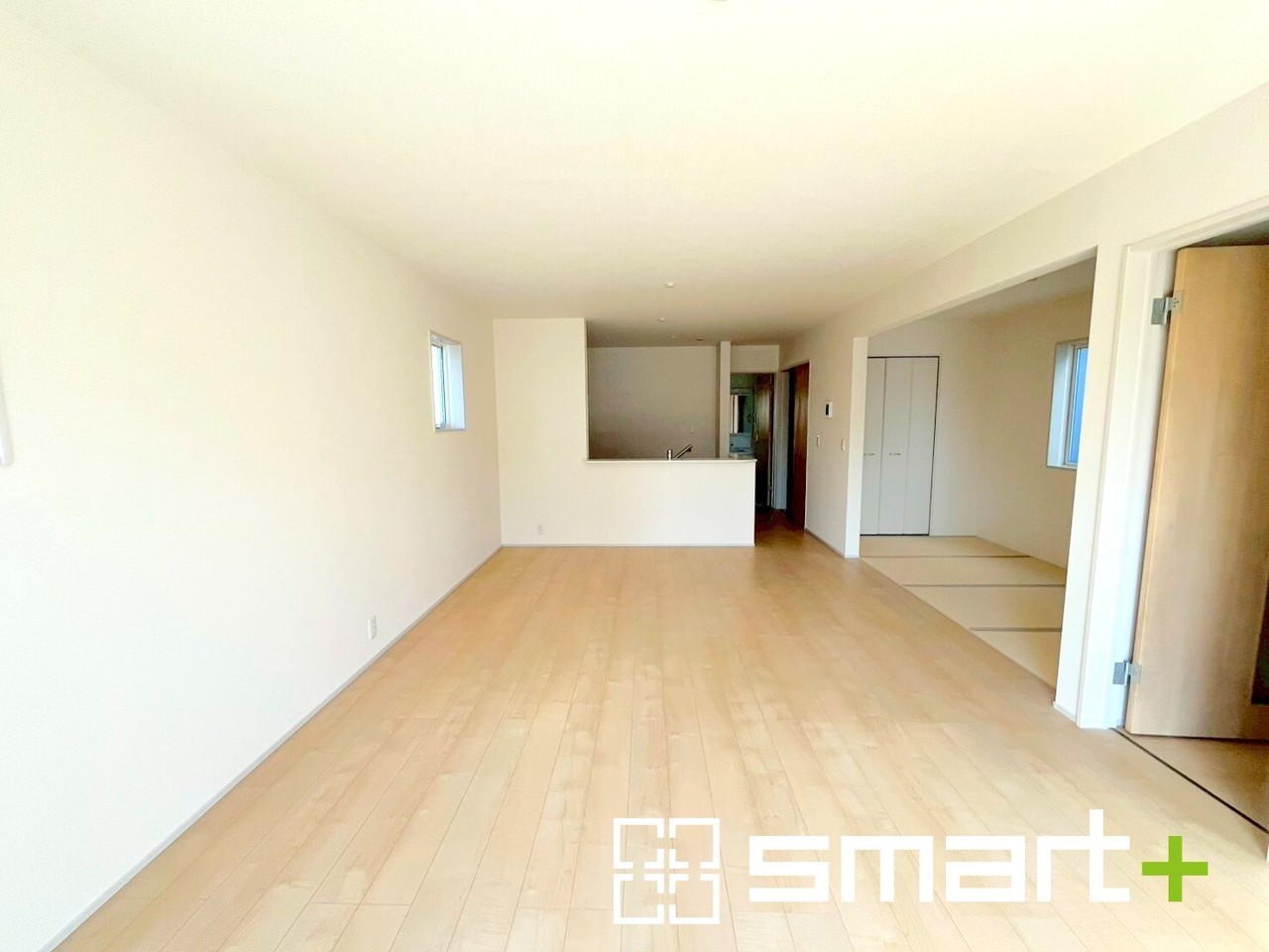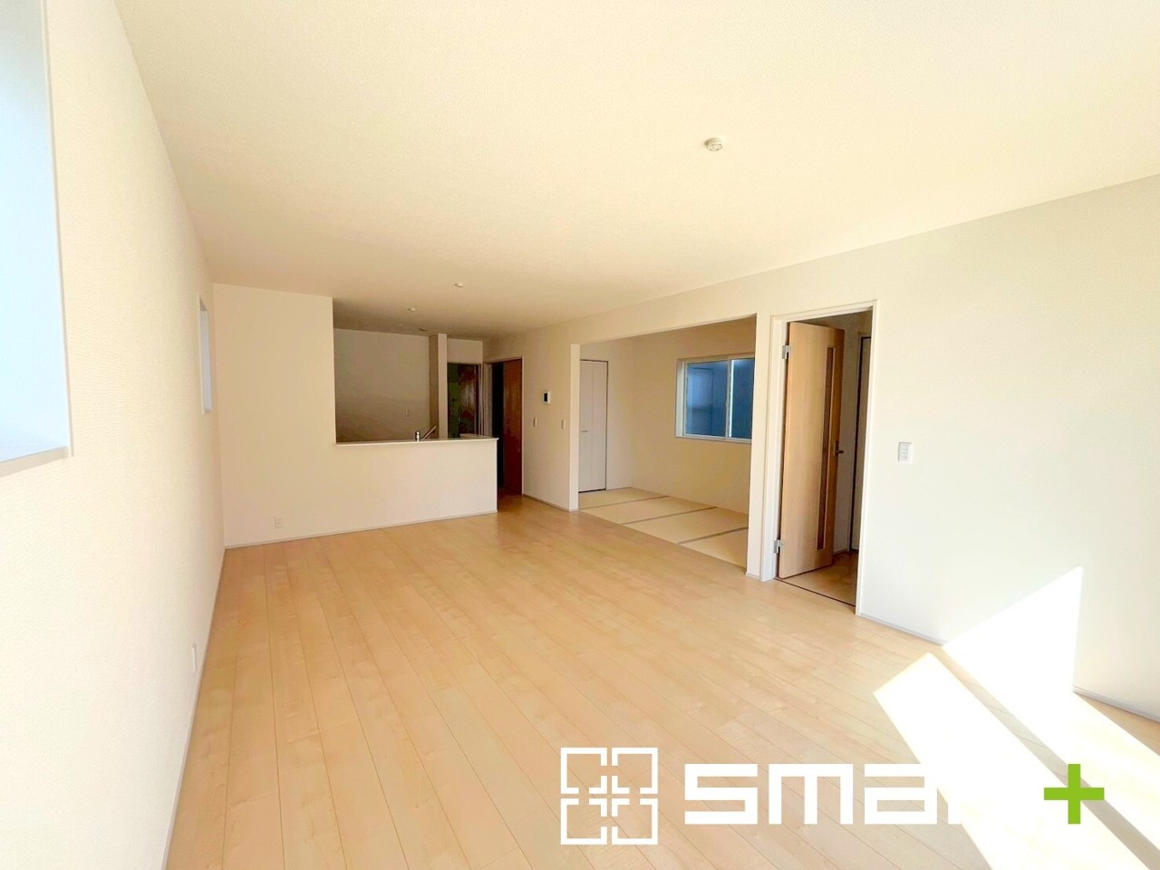 2号棟 ~ゆとりある広さのLDK~ ・穏やかな陽だまりに包まれる居心地の良いLDKは、ご家族が自然と集まる憩いのスペースになりそうですね。 ・4帖分の畳コーナーと合わせて22帖の広々空間に。