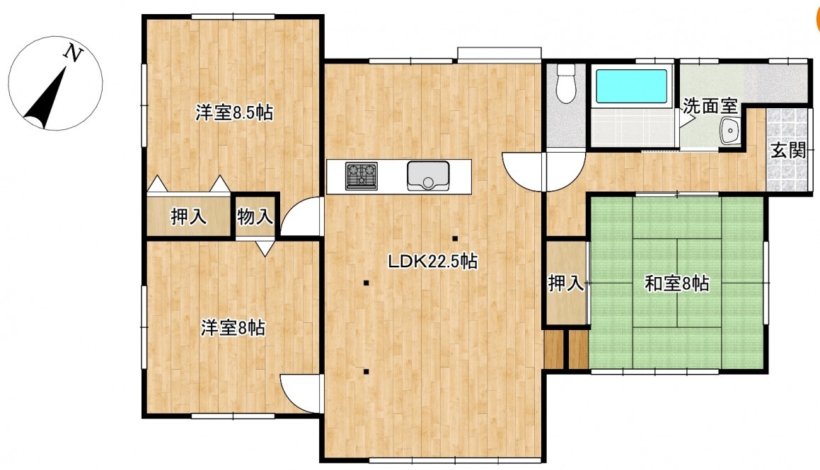 | 間取 | 3LDK (LDK22.5帖、和室8帖、洋室8.5帖、洋室8帖) | ||