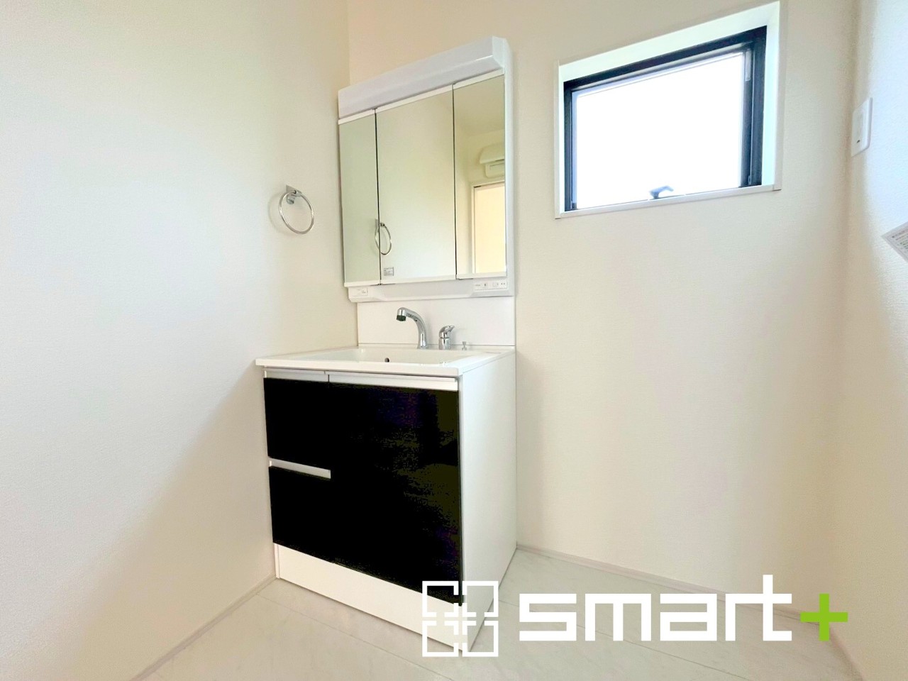 ~明るい洗面スペース~ ・窓から明るい陽が入り、気持ちよく朝の支度ができますね。 ・使い勝手の良い三面鏡タイプのシャワー付き洗面化粧台。鏡の裏に収納があるので洗面台周りもスッキリ。 (1号棟)