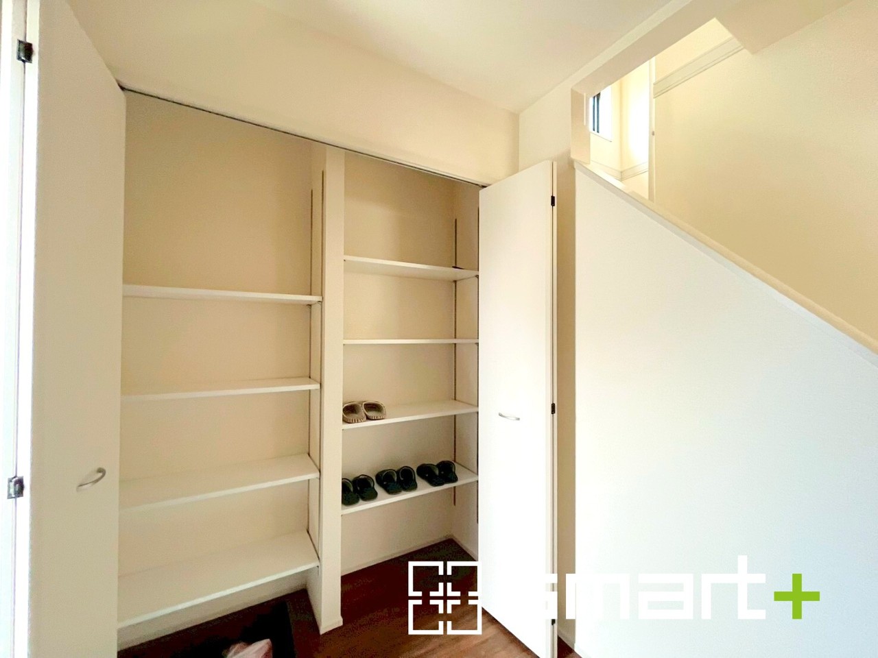 ~たっぷりしまえるシューズボックス~ ・備え付けのシューズボックスは充分な容量を確保。 ・便利な稼働式の棚で高さや大きさのあるものもスッキリしまえて快適。 (1号棟)