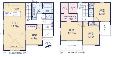 | 間取 | 4LDK + WIC、ホールクローク、フリースペース (LDK17.5帖、洋室10.7帖、洋室5.6帖、洋室5.2帖、洋室4.9帖) | ||