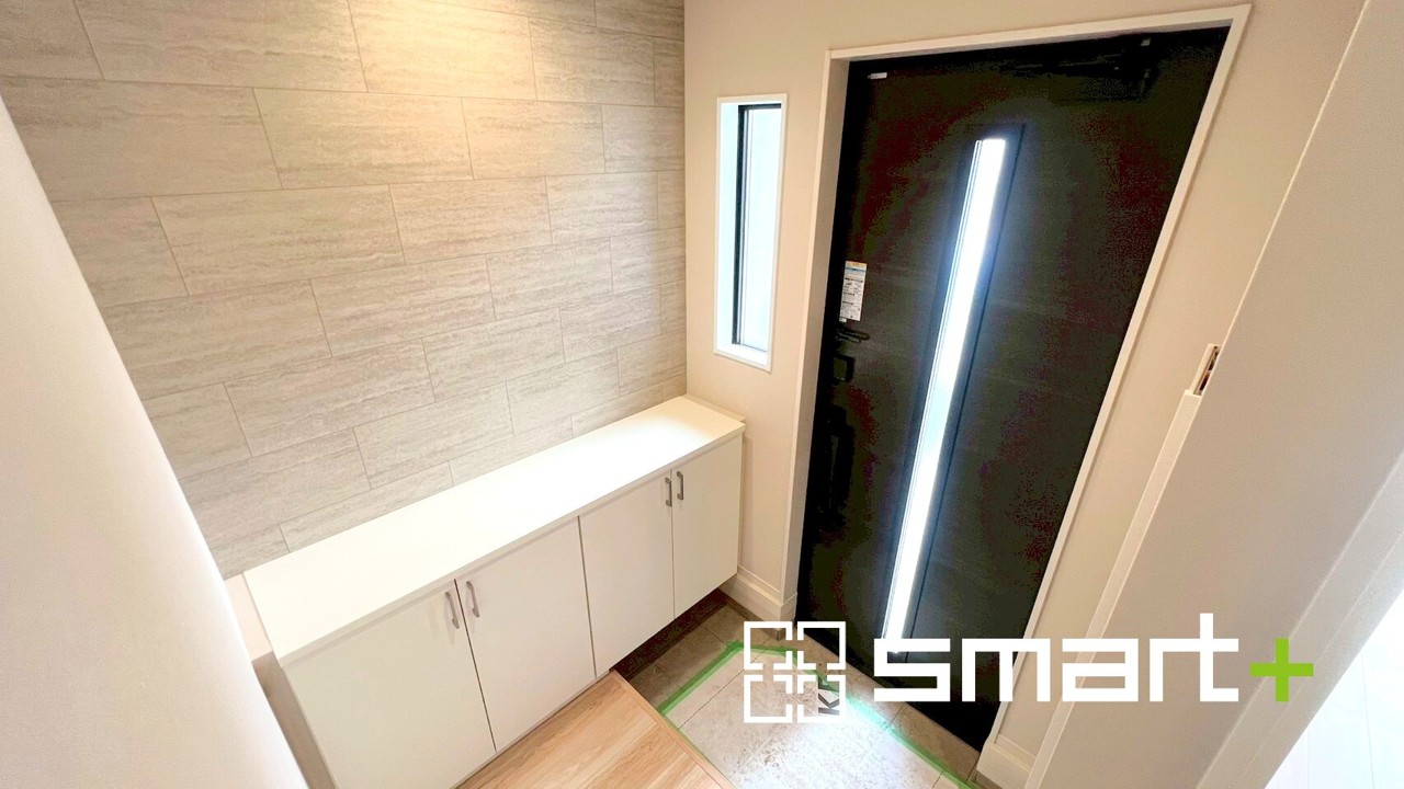 ~圧迫感のない明るい玄関~ ・窓に加えて玄関ドアのガラス部分からも穏やかな陽が入り、明るい玄関になります。 ・備え付けのシューズボックスはたっぷりしまえて玄関がスッキリ片付きますね。