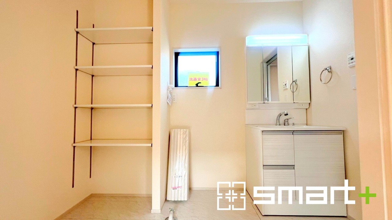 1号棟 ~収納も充実の洗面所~ ・洗面所にはリネンスペースを設ける事でタオルや洗剤などの置場にも困りません。 ・意外とリネンスペースがある物件は少ないので、ぜひ現地でその魅力をご確認ください。 2026/04/07m