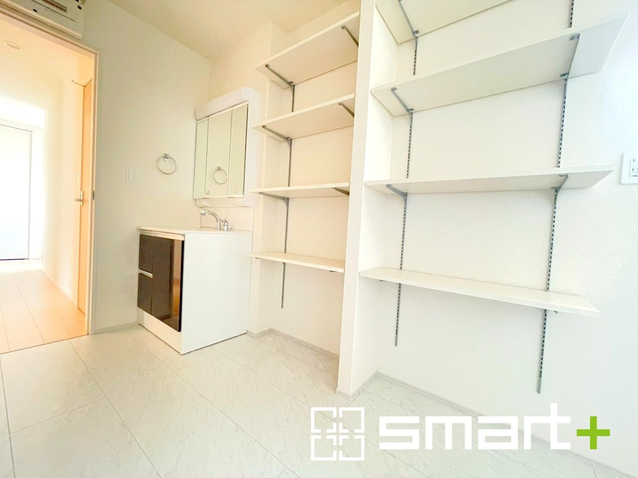 ~たっぷりの収納スペース~ ・キッチン横には食材や台所用品のストックもたくさんしまえる便利な棚付き。 ・買い溜めした食材などはもちろん、ティッシュなどの置場としてもご利用いただけます。 (1号棟)