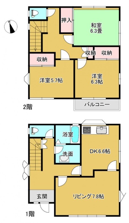 | 間取 | 3LDK (LDK14.4帖、和室6.3帖、洋室6.3帖、洋室5.7帖) | ||