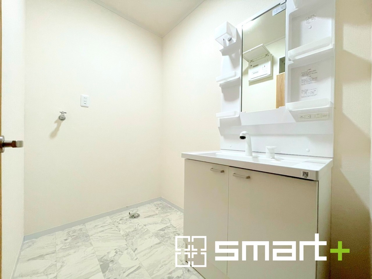 ~収納も充実の洗面台~ ・洗面台は鏡の両側に物を置くスペースがございますので、整髪料や歯ブラシなどもスッキリと片付け可能。 ・洗面台下のパイプスペースにも洗剤などをご収納いただけます。