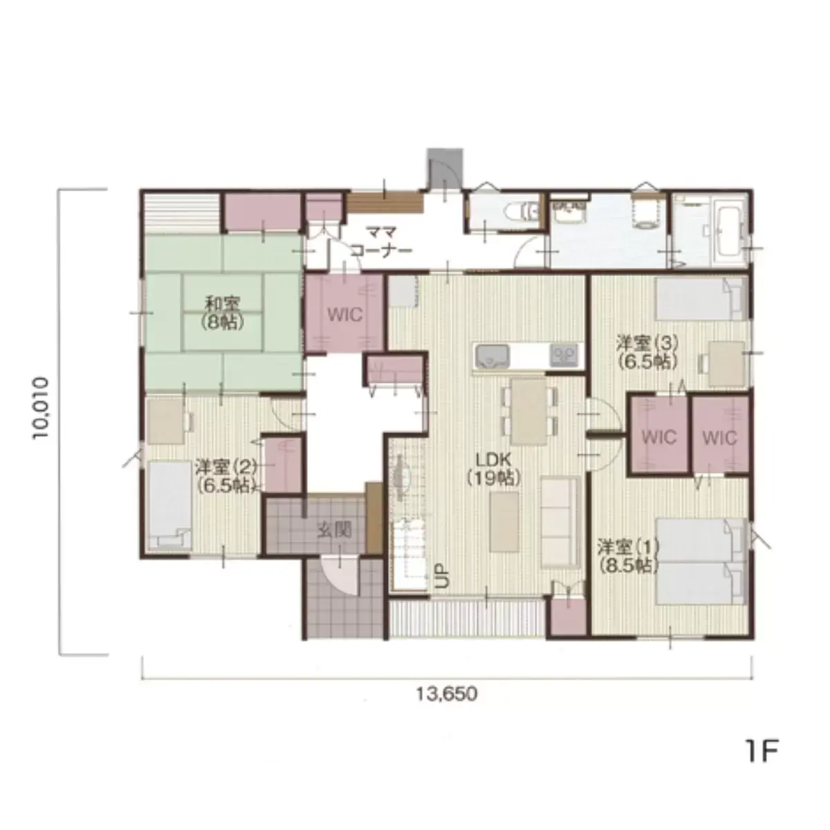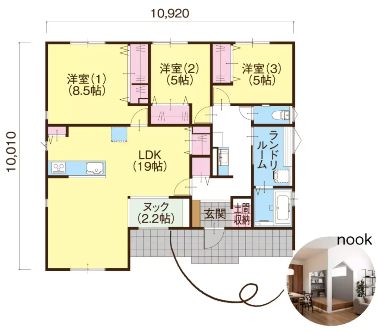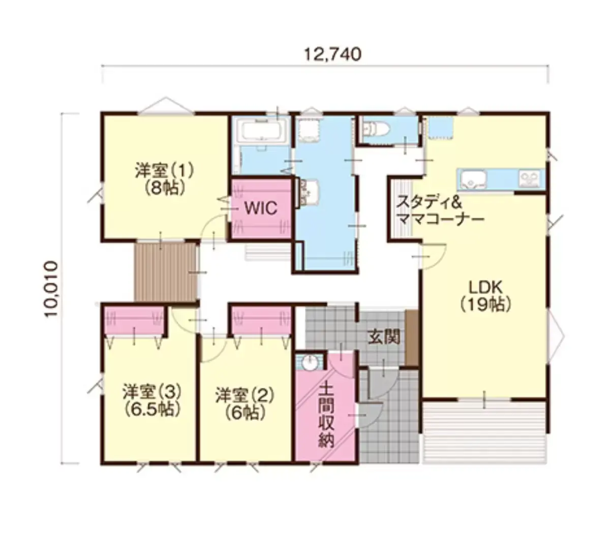 玄関には手洗器の付いた土間収納。リビングにはスタディ&ママコーナー。ランドリースペースとWICもあり充実のプラン。