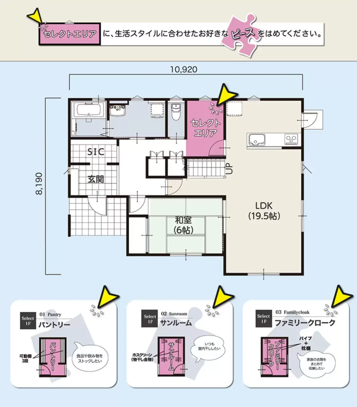 ホーム選べる豊富プラン「Select」 は選べる豊富なプラン 人気の平屋 平屋L サンテラス サン・ステ はぴママ カラフル セレクト ベーシック イロドリ 平屋プラン 27坪 30坪 33坪 36坪 40坪 40坪以上 二世帯 Select 43S6.0b 3つのアイテムから選べる「セレクト」エリアが魅力のプラン。 本体価格 1,950.3万円(税込)(別途附帯工事、諸費用等が必要になります) プラン 4LDK 延べ床面積 144.91㎡(43.84坪)